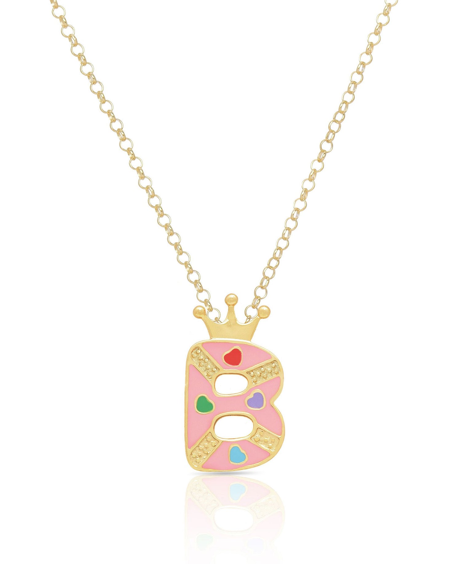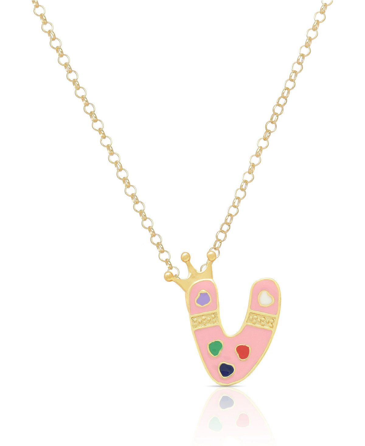 Make it personal! This charming necklace for girls features an initial with a crown and a heart motif. Adorned with hand-painted enamel and plated with 18k gold that shines with a high-polish finish. Chain is adjustable 14" - 16" and secures with spring clasp.
