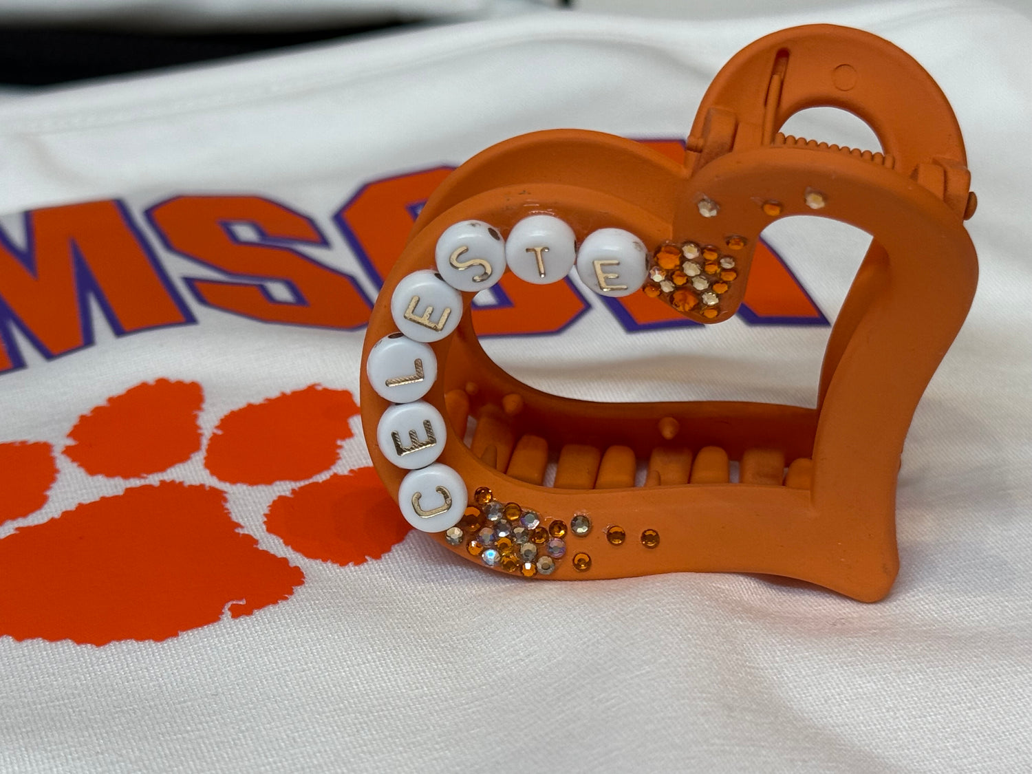 This heart shaped hair clip proudly displays your school name and colors. Expertly crafted for a secure hold, it adds a touch of style and school spirit to any outfit. Perfect for students and alumni alike.