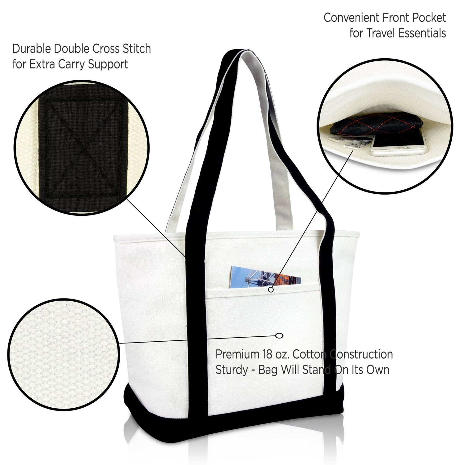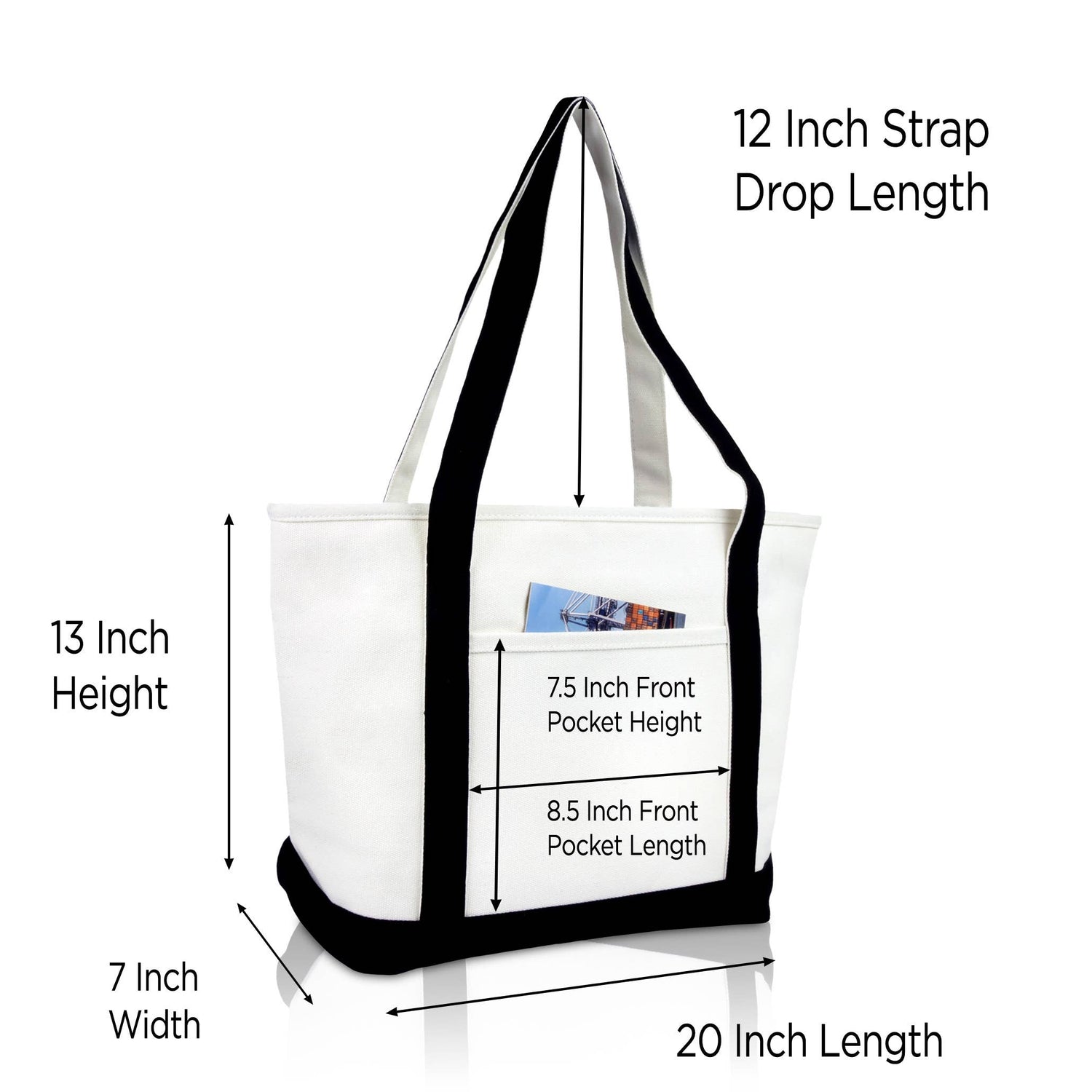 Made with 100% premium cotton canvas, its structured rigidness leaves it standing upright by itself and keeps shape when packing more. Main compartment is spacious to fit most items (20 inches Length x 7 inch Depth x 13 Inch Height). Has a front pocket (8.5 inches Width x 7.5 inches Height) for smaller accessories and inner zippered pouch pocket (7 inches Height x 7 inches Width) for valuable belongings. Features a keychain strap with a quick-clip lobster clasp sewn in to help keep your keys in sight.