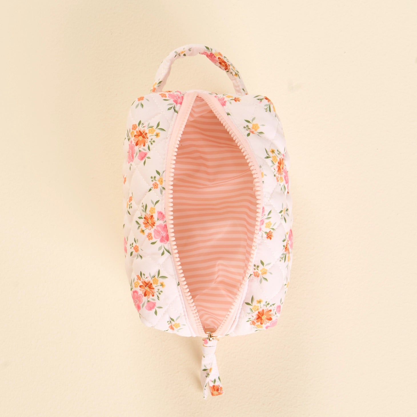 Perfect size for your daily must-haves Soft quilted fabric with a small handle for easy hanging Gold zipper hardware for a polished finish Wipeable interior lining for easy cleaning Measures 7.5” x 3.5” x 5”