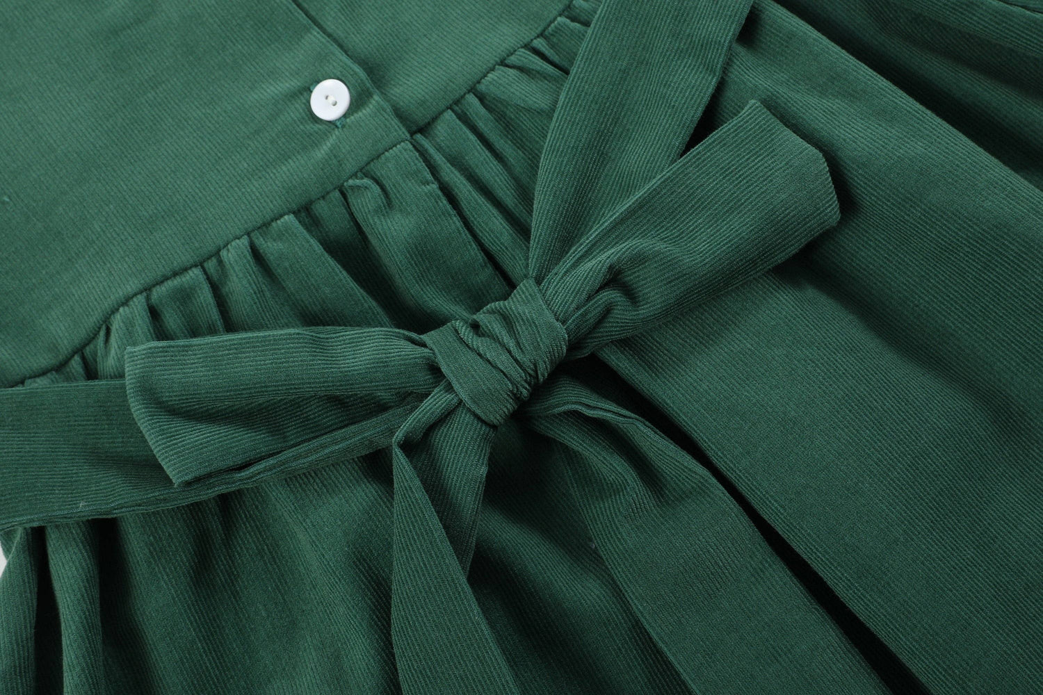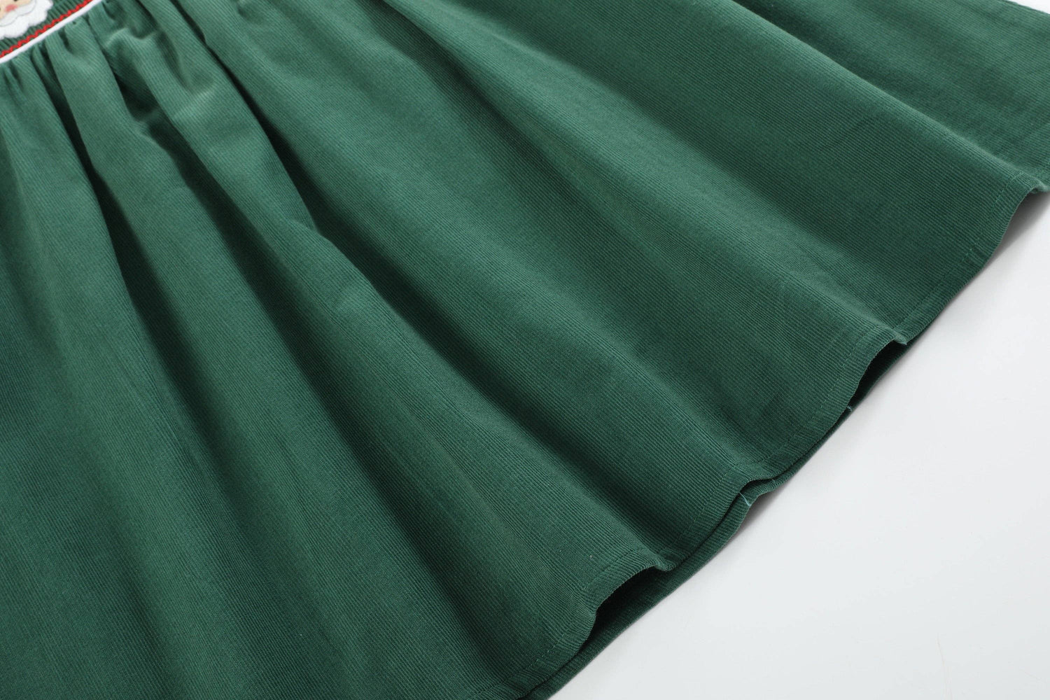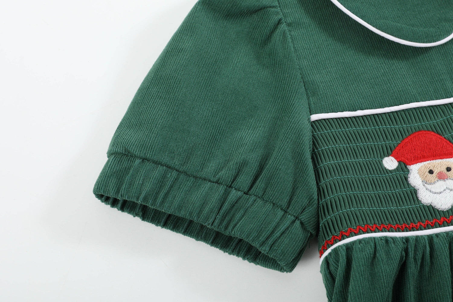 This Green Corduroy Santa Smocked Dress is a cozy and charming choice for the holiday season. The smocked bodice is embroidered with festive Santas, adding a playful touch. Made from 100% cotton, the dress is both warm and breathable. Piping trim on the collar enhances its classic appeal, while the tie bow on the back and back buttons ensure easy wear. Perfect for winter gatherings and celebrations.