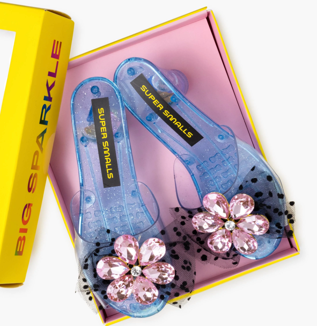 Ready for your Broadway debut? Our Opening Night Play Shoes are perfect for playtime! These sparkly blue kitten heels are just begging for a spin at the after party. Complete with an oversized flower jewel, black tulle bow, and colorful gems in the heel (that jingle while you walk!), your dress-up chest just got a Super fashion-forward upgrade.