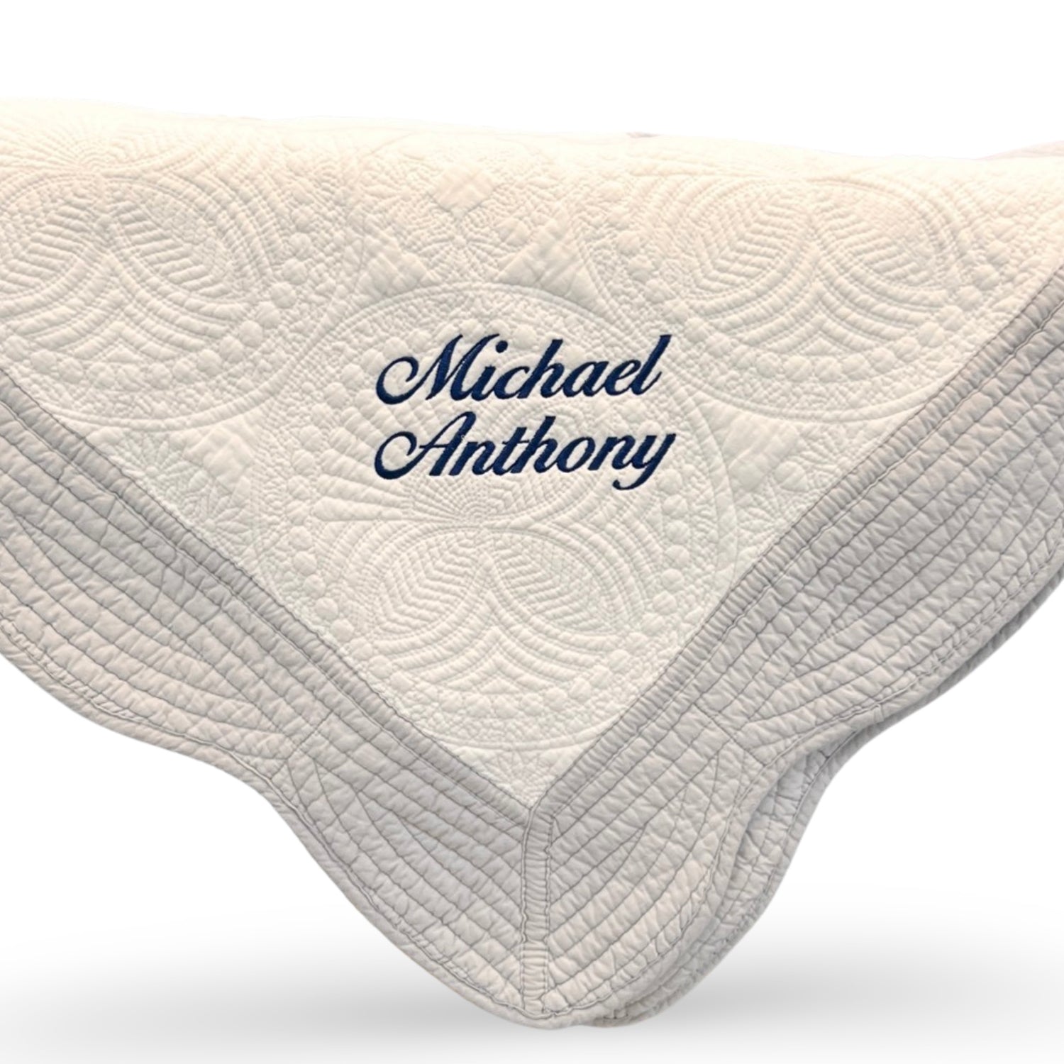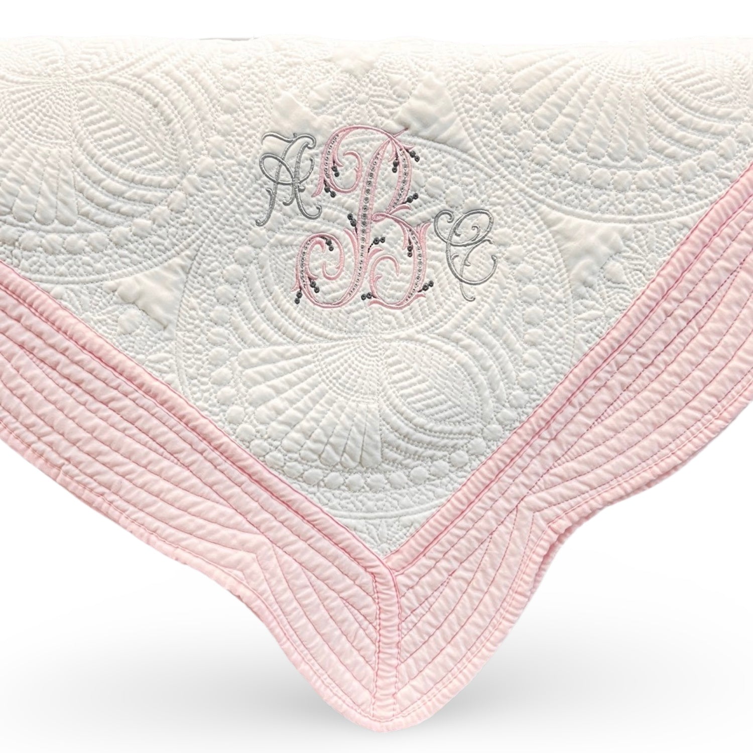 This beautiful cotton quilt is designed and quilted with medallions and has a scallop trim.