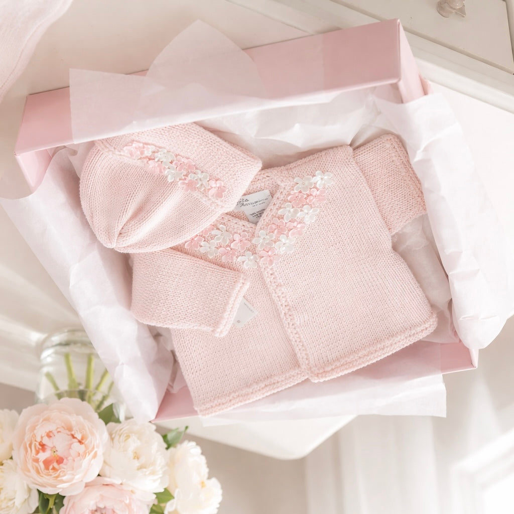 This gorgeous hand knit sweater is a stunning gift for a baby girl. The detail on the flowers make it an extra special gift.
