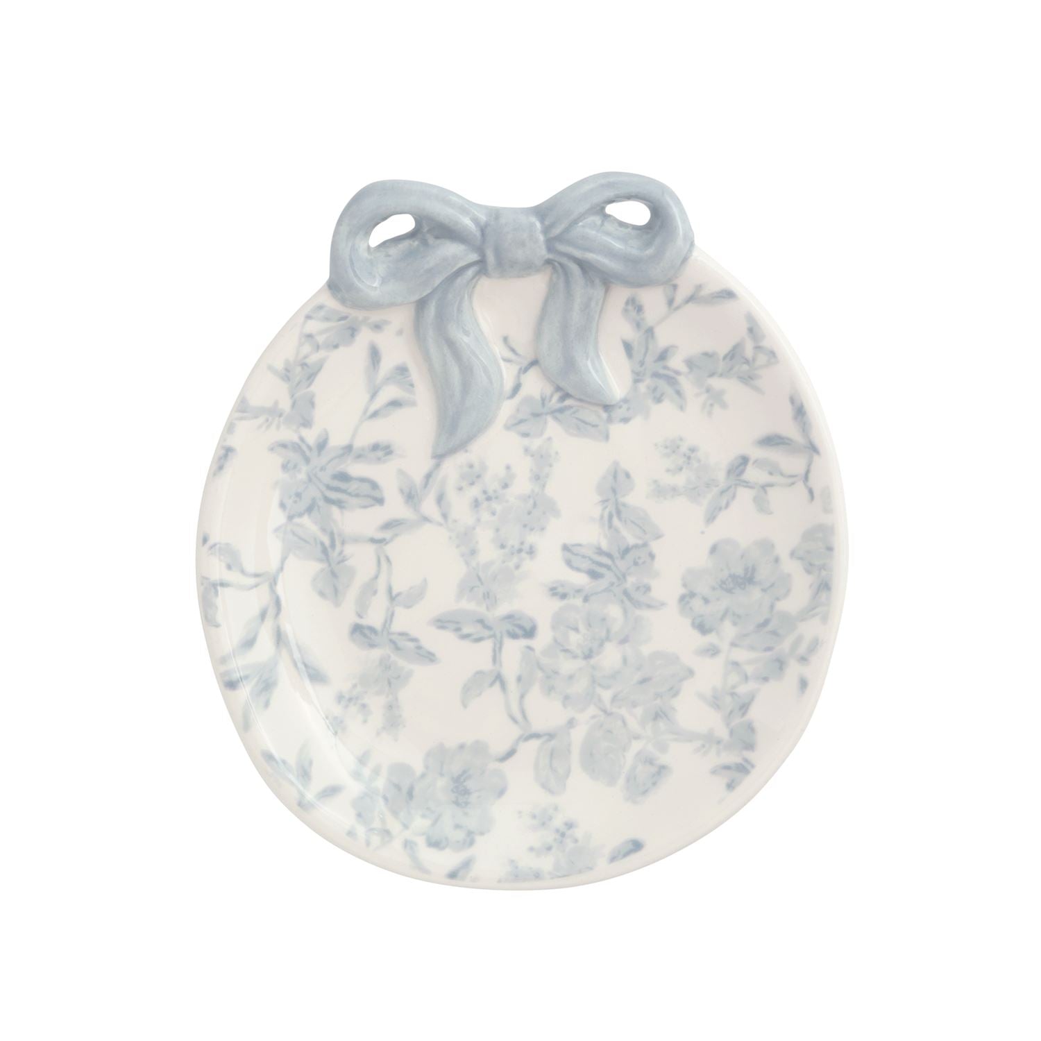 Ceramic ring dish features hand-painted, dimensional ceramic bow and ribbon detail around rim.