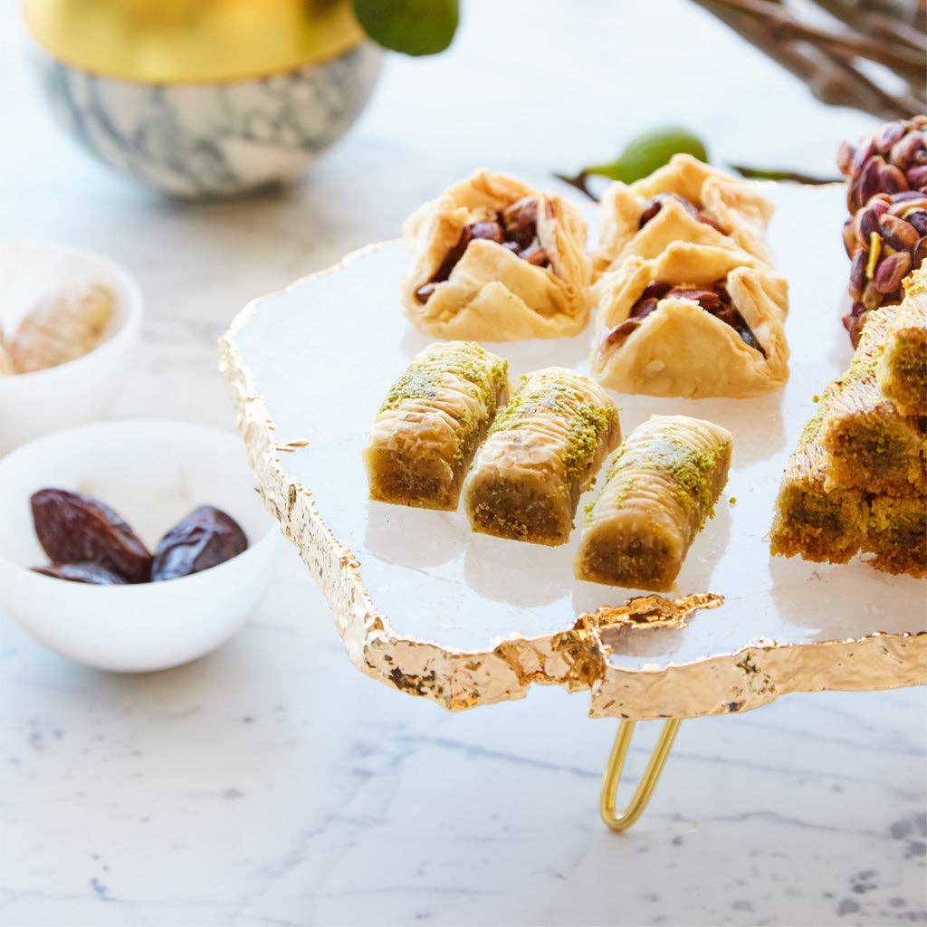 The Torta Cake Stand is a stunning addition to any table, effortlessly elevating whatever you choose to place on it—be it cakes and pies, a beautifully arranged fruit display, or your child's latest culinary creation. Handcrafted from semi-precious Crystal Gemstones, this exquisite piece is believed to embody qualities of clarity, unconditional love, and friendship, making it the perfect accompaniment for gatherings with friends and loved ones. Edged in 24k gold, the versatility of this pedestal knows no bounds, limited only by your imagination.