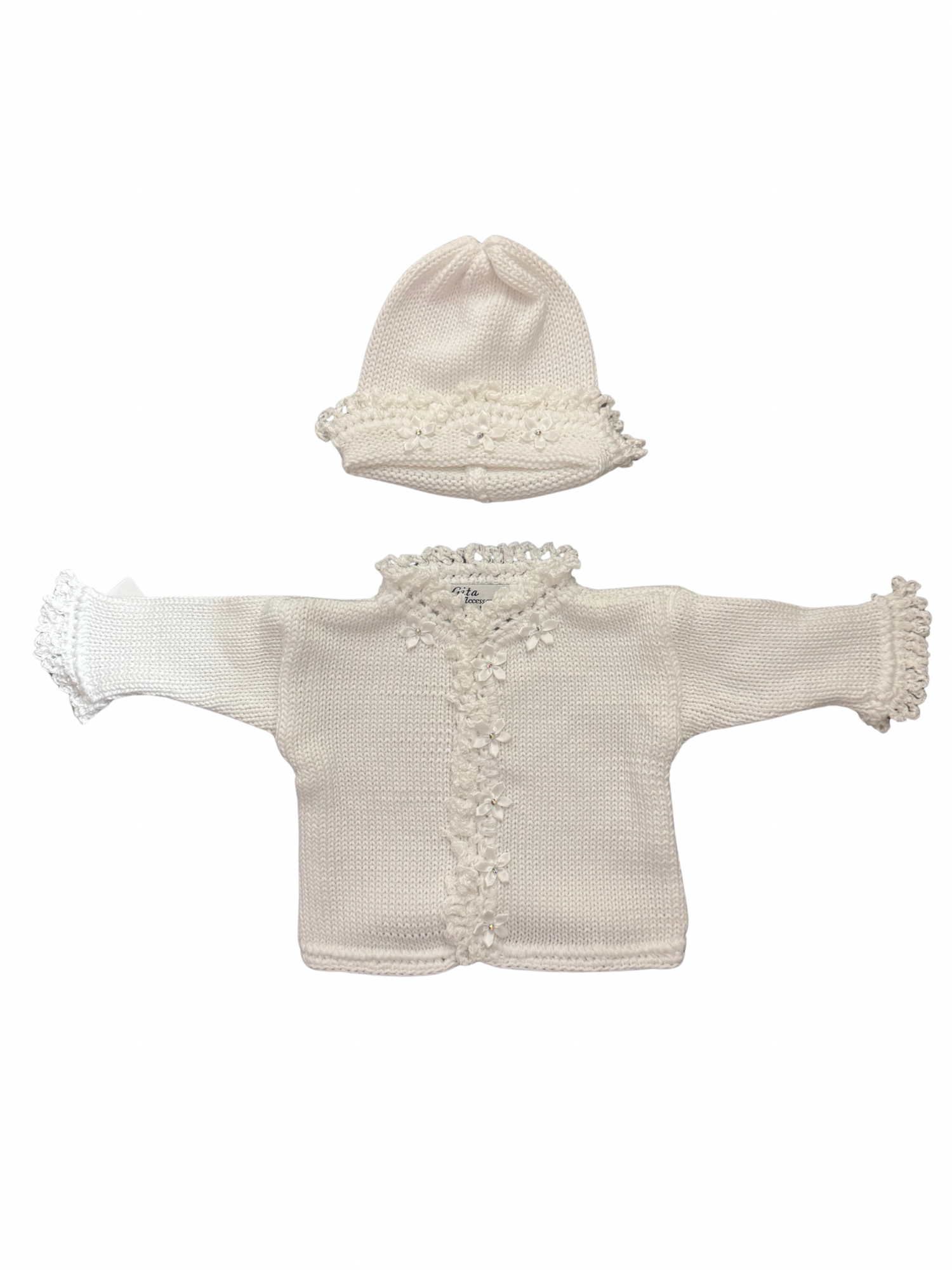 This soft white sweater and matching hat set, detailed with cozy chenille trim, offers delicate warmth and comfort for your baby. Designed with gentle materials, it ensures a snug fit while providing breathable softness, ideal for keeping little ones comfortable in cooler weather. Elegant yet practical, this set is perfect for everyday wear or special occasions.
